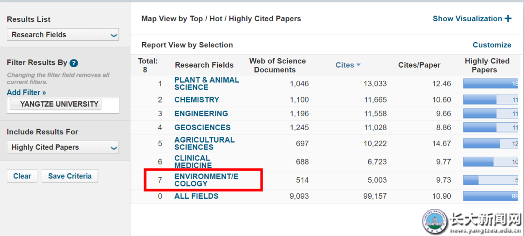 “环境与生态学”学科是我校继“工程学”“植物学与动物学”“农业科学”“地球科学”“临床医学”“化学”6个学科进入ESI全球排名前1%行列之后,又一进入学科。至此,我校入选ESI前1%学科总数达到7个,进入的学科数量位居省属高校首位。