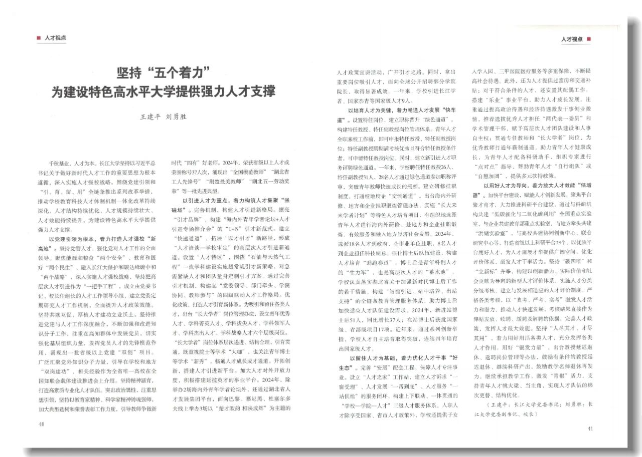近日,由中共湖北省委组织部、中共湖北省委党的建设工作领导小组办公室主办的《湖北党建》(2025年第1期)刊发了我校党委书记王建平、校长刘勇胜共同署名的理论文章:《坚持“五个着力” 为建设特色高水平大学提供强力人才支撑》。